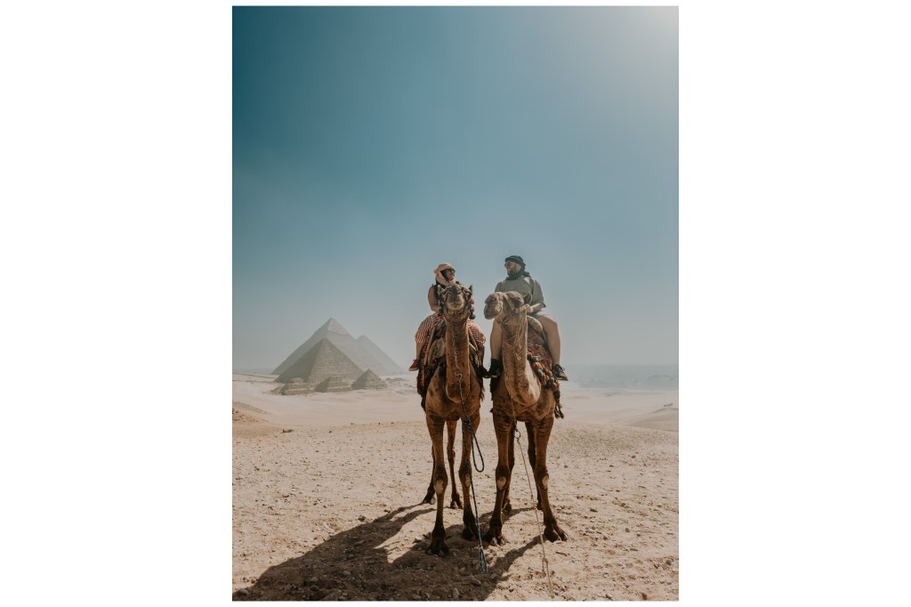 The next day, our official tour began. Our guide picked us up directly from the hotel and brought us straight to the Giza Plateau. We chose not to go inside the pyramids, and instead did the camel ride to the panoramic viewpoint where you can see all nine pyramids together. It was such a surreal moment — riding through the desert on camelback with the ancient structures towering in the background.